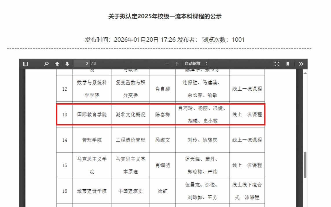 (通讯员 陈春梅 杨丽)近日,根据武汉科技大学本科生院发布的《关于拟认定2025年校级一流本科课程的公示》,由我院对外汉语教研室陈春梅老师主持的《湖北文化概况》课程成功入选校级一流本科课程。这是该课程继获评2025年度湖北省来华留学生“了解中国”优秀课程后,在教学建设领域取得的又一重要认可。